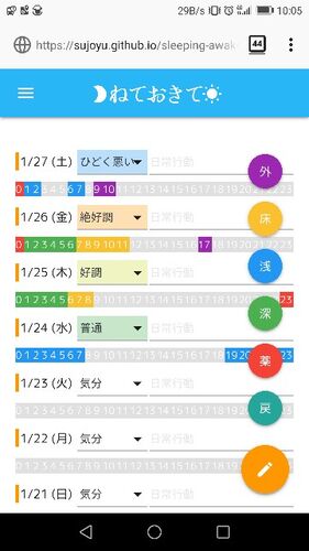 はい、どーも! えー、今回はですね。日本うつ病学会が出している、睡眠·覚醒リズム表、こちらをWebアプリ化してみました! オンライン 睡眠・覚醒リズム表「ねておきて」 このリズム表というのは、双極性障害(躁うつ病)向けのプログラムで、自身の調子の…